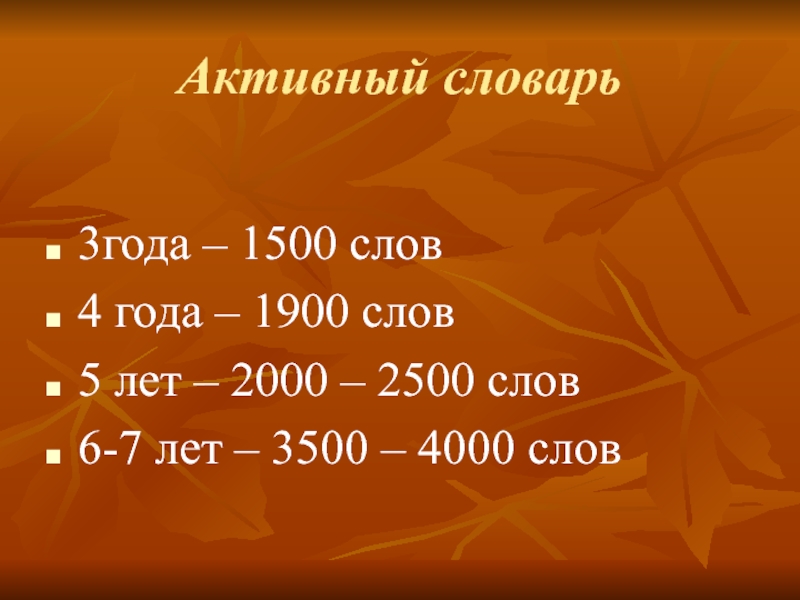 Активный словарь3года – 1500 слов4 года – 1900 слов5 лет – 2000 – 2500 слов6-7 лет –