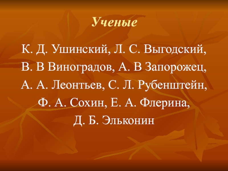 УченыеК. Д. Ушинский, Л. С. Выгодский, В. В Виноградов, А. В Запорожец, А. А. Леонтьев, С. Л.