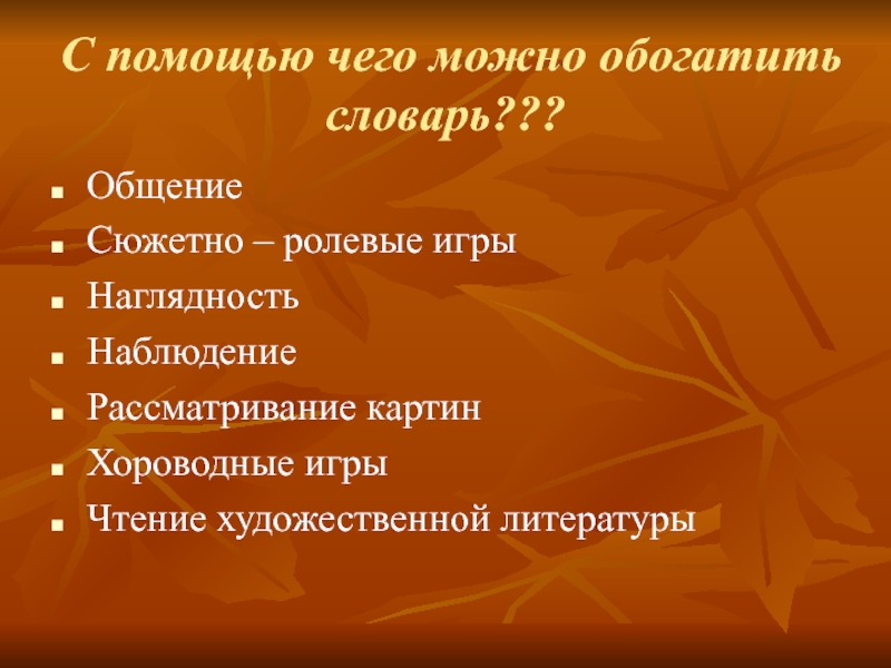 С помощью чего можно обогатить словарь???ОбщениеСюжетно – ролевые игрыНаглядностьНаблюдениеРассматривание картинХороводные игрыЧтение художественной литературы