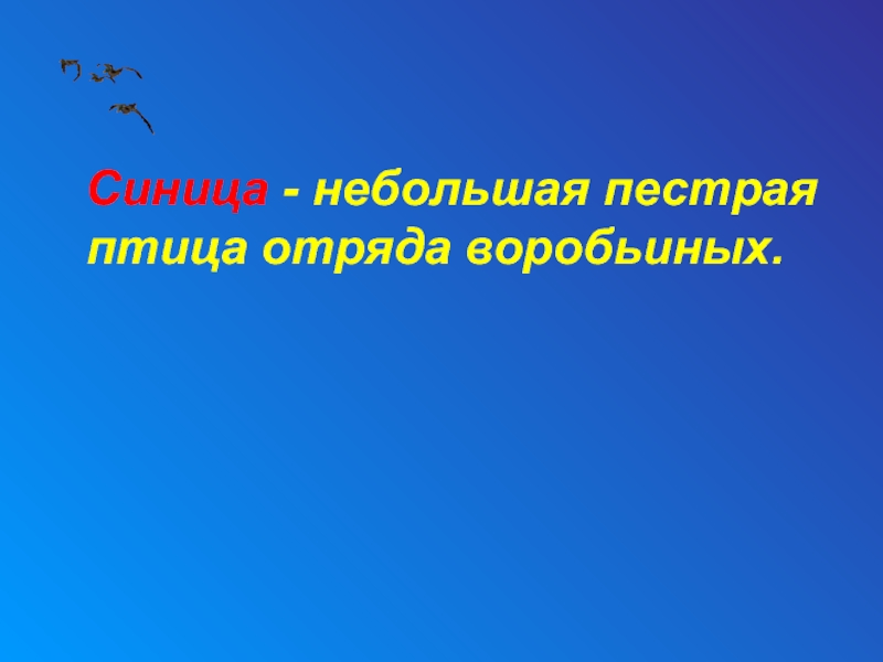 Слайд 15 Синица - небольшая пестрая птица отряда воробьиных.