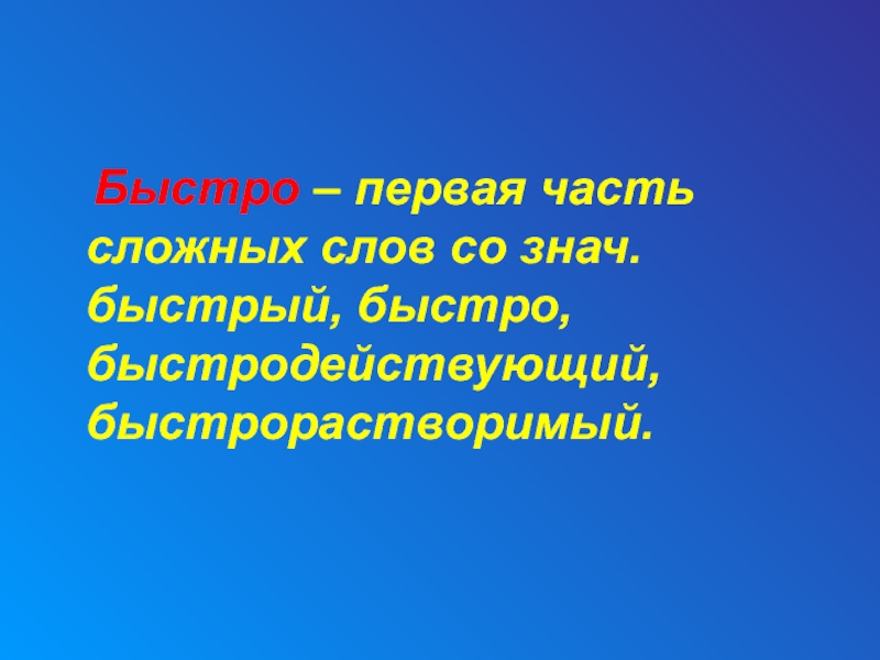 Слайд 623 Быстро – первая часть сложных слов со знач. быстрый,