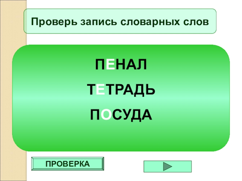 ПРОВЕРКАПроверь запись словарных словПЕНАЛТЕТРАДЬПОСУДА
