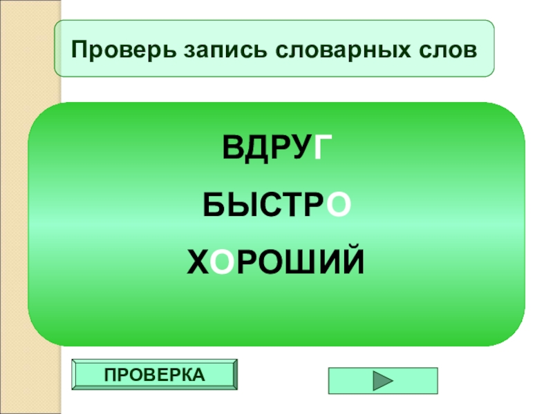 ПРОВЕРКАПроверь запись словарных словВДРУГБЫСТРОХОРОШИЙ