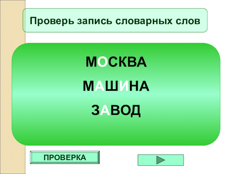 ПРОВЕРКАПроверь запись словарных словМОСКВАМАШИНАЗАВОД