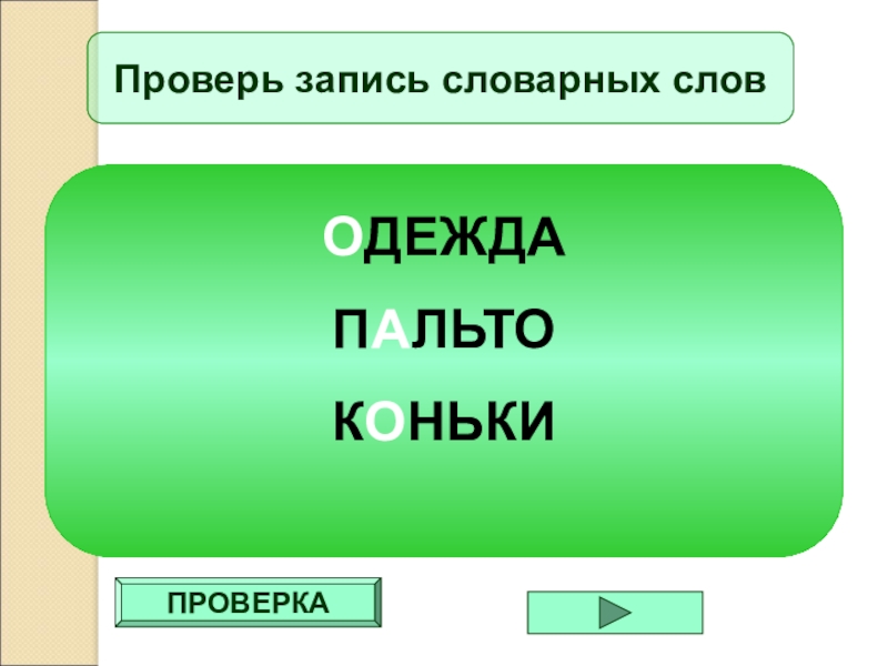 ПРОВЕРКАПроверь запись словарных словОДЕЖДАПАЛЬТОКОНЬКИ