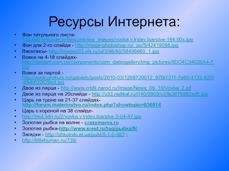 Ресурсы Интернета:Фон титульного листа- http://d2.krasnoe.tv/files/preview_images/vovka.v.tridev.tsarstve-164.00s.jpg      Фон для 2-го слайда - http://mega-photoshop.ru/_pu/5/42419098.jpg Василисы-
