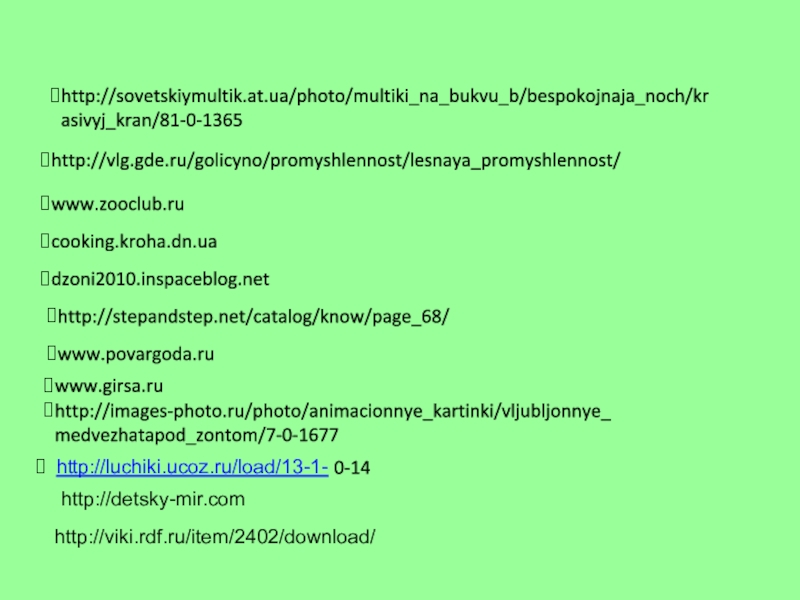 http://sovetskiymultik.at.ua/photo/multiki_na_bukvu_b/bespokojnaja_noch/krasivyj_kran/81-0-1365http://vlg.gde.ru/golicyno/promyshlennost/lesnaya_promyshlennost/cooking.kroha.dn.uadzoni2010.inspaceblog.netwww.girsa.ruwww.povargoda.ruhttp://stepandstep.net/catalog/know/page_68/http://images-photo.ru/photo/animacionnye_kartinki/vljubljonnye_medvezhatapod_zontom/7-0-1677www.zooclub.ruhttp://luchiki.ucoz.ru/load/13-1- 0-14http://viki.rdf.ru/item/2402/download/http://detsky-mir.com