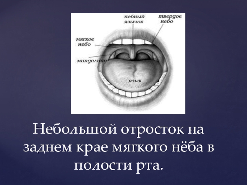 Слайд 6Небольшой отросток на заднем крае мягкого нёба в полости рта.