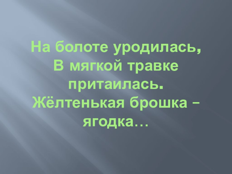Слайд 20На болоте уродилась, В мягкой травке притаилась. Жёлтенькая брошка – ягодка…
