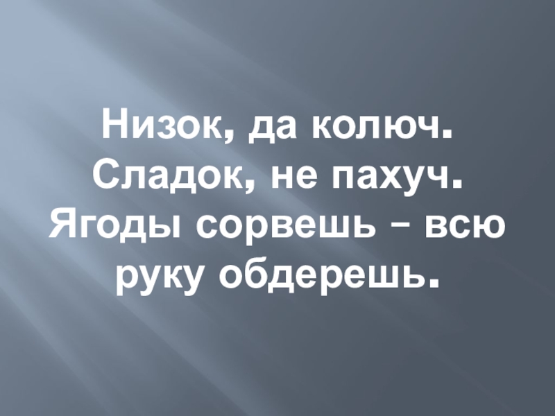Слайд 8Низок, да колюч. Сладок, не пахуч. Ягоды сорвешь – всю руку обдерешь.