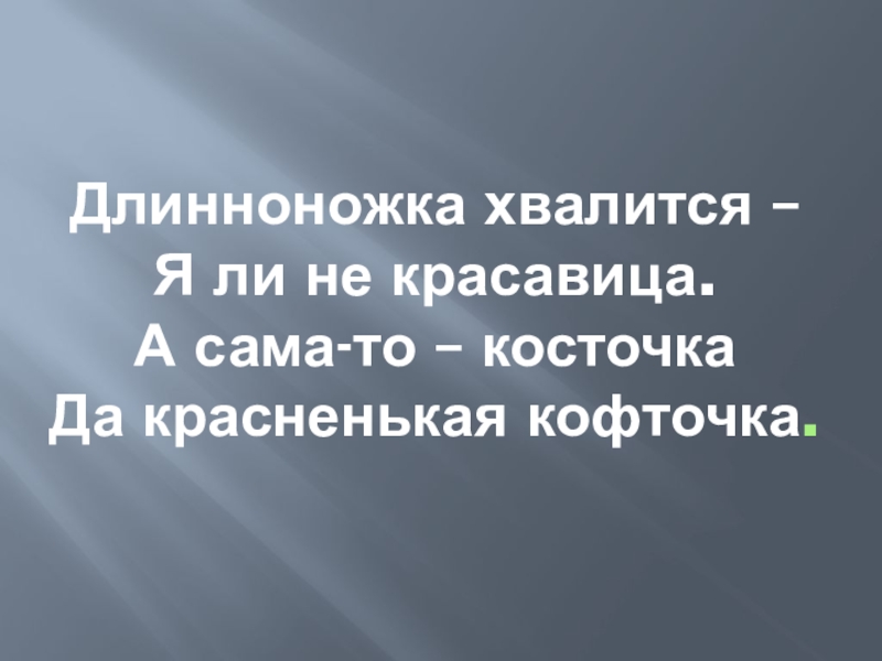 Слайд 12Длинноножка хвалится – Я ли не красавица. А сама-то – косточка Да красненькая кофточка.