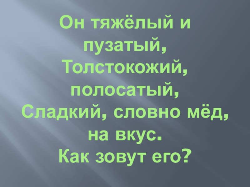 Слайд 14Он тяжёлый и пузатый, Толстокожий, полосатый, Сладкий, словно мёд, на вкус. Как зовут его?