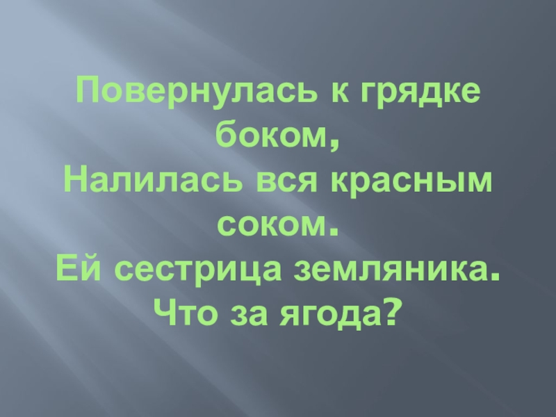 Слайд 10Повернулась к грядке боком, Налилась вся красным соком. Ей сестрица земляника. Что за ягода?