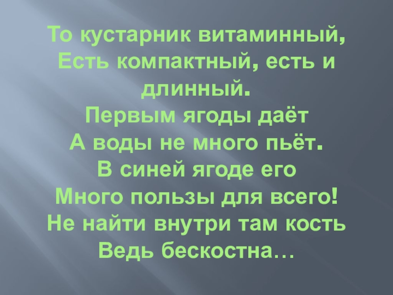 Слайд 16То кустарник витаминный, Есть компактный, есть и длинный. Первым ягоды даёт А воды не