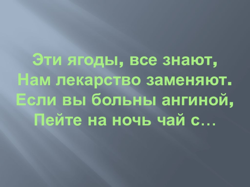 Эти ягоды, все знают, Нам лекарство заменяют. Если вы больны ангиной, Пейте на ночь чай с…