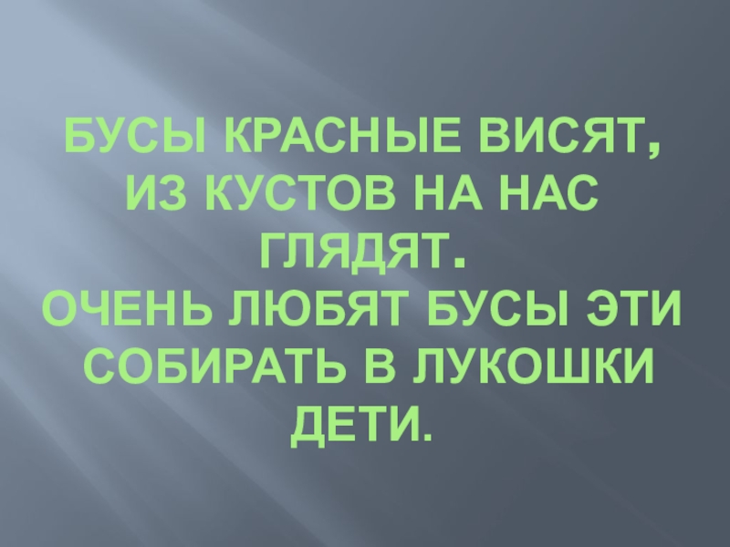 Слайд 2Бусы красные висят, Из кустов на нас глядят. Очень любят бусы эти Собирать