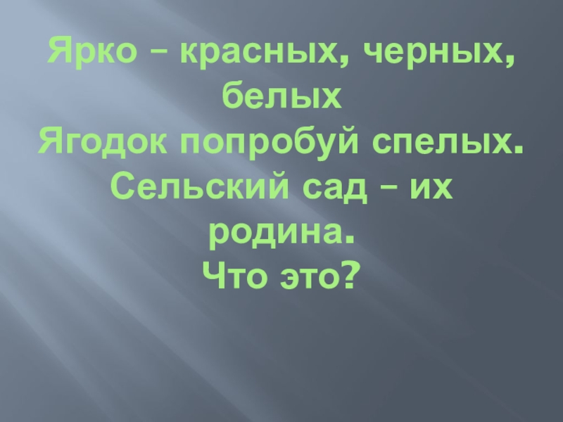 Слайд 4Ярко – красных, черных, белых Ягодок попробуй спелых. Сельский сад – их родина. Что