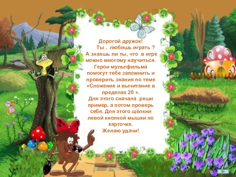Дорогой дружок! Ты , любишь играть ? А знаешь ли ты, что в игре можно многому научиться. Герои мультфильма помогут тебе запомнить и проверить знания по теме «Сложение и вычитание в пределах 20