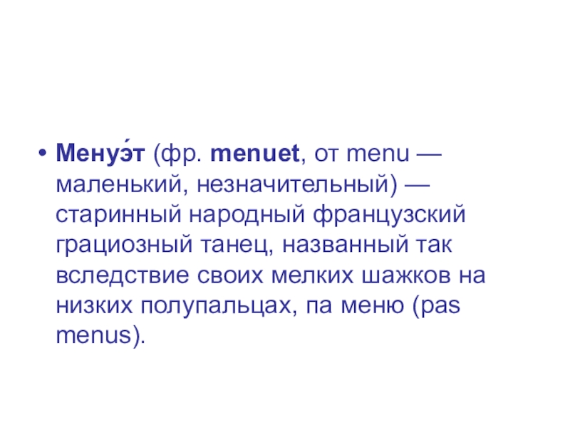 Менуэ́т (фр. menuet, от menu — маленький, незначительный) — старинный народный французский грациозный танец, названный так вследствие своих мелких шажков на низких полупальцах, па меню (pas menus).