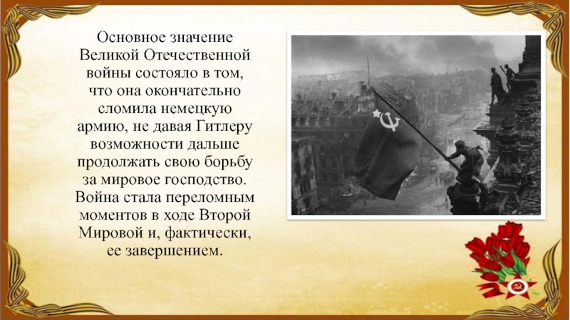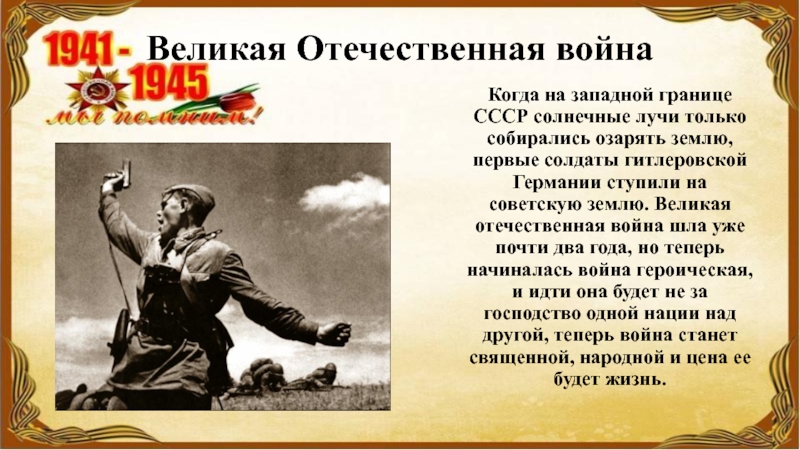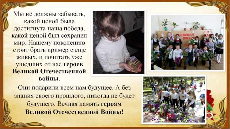 Они подарили всем нам будущее. А без знания своего прошлого, никогда не будет будущего. Вечная память героям Великой Отечественной Войны!