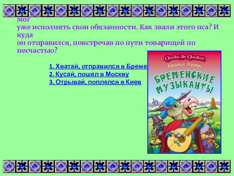 стар и не мог уже исполнять свои обязанности. Как звали этого пса? И куда он отправился, повстречав по пути товарищей по несчастью? 1. Хватай, отправился в Бремен 2. Кусай, пошел в Москву 3. Отрывай, поплелся в Киев
