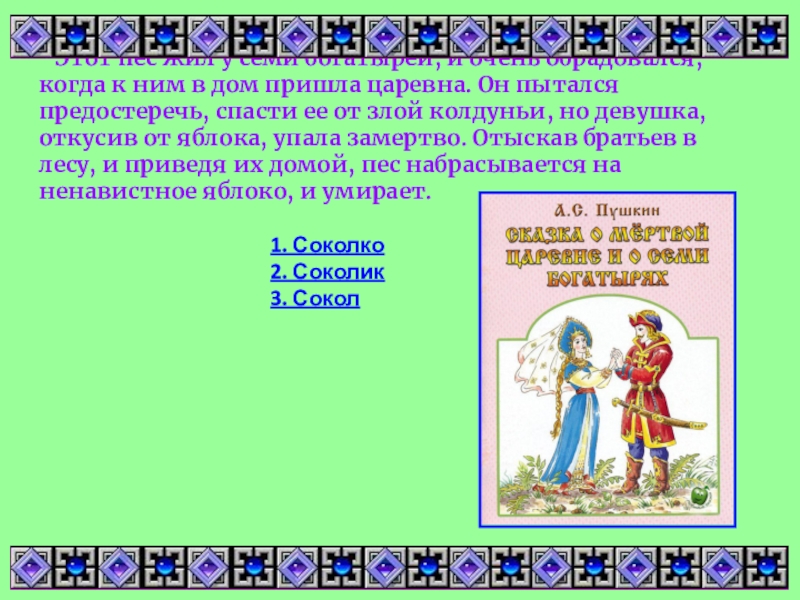 когда к ним в дом пришла царевна. Он пытался предостеречь, спасти ее от злой колдуньи, но девушка, откусив от яблока, упала замертво. Отыскав братьев в лесу, и приведя их домой, пес набрасывается на ненавистное яблоко, и умирает. 1. Соколко 2. Соколик 3. Сокол