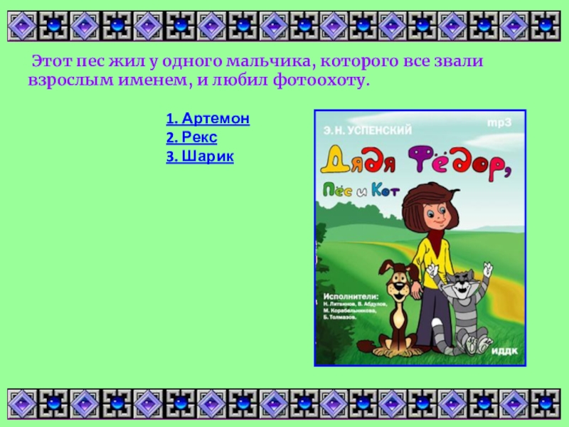 именем, и любил фотоохоту. 1. Артемон 2. Рекс 3. Шарик