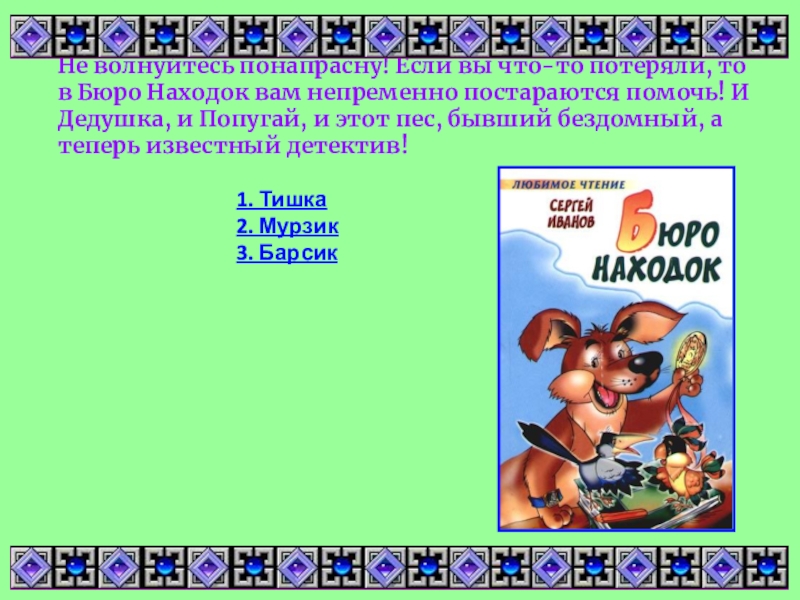вам непременно постараются помочь! И Дедушка, и Попугай, и этот пес, бывший бездомный, а теперь известный детектив! 1. Тишка 2. Мурзик 3. Барсик