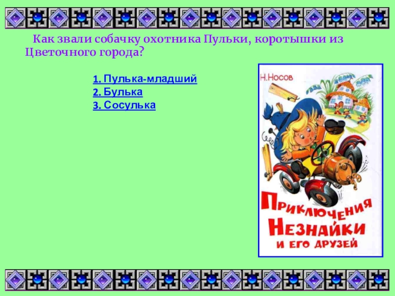 Слайд 8 Как звали собачку охотника Пульки, коротышки из Цветочного города?