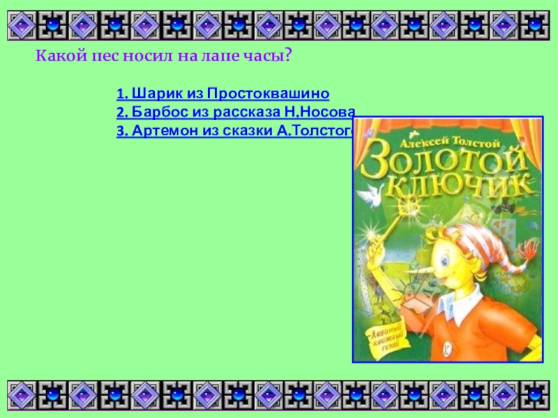 1. Шарик из Простоквашино 2. Барбос из рассказа Н.Носова 3. Артемон из сказки А.Толстого