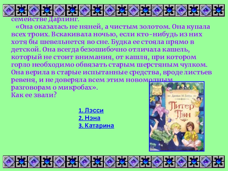 «Она оказалась не няней, а чистым золотом. Она купала всех троих. Вскакивала ночью, если кто-нибудь из них хотя бы шевельнется во сне. Будка ее стояла прямо в детской. Она всегда безошибочно отличала кашель, который не стоит внимания, от кашля, при котором горло необходимо обвязать старым шерстяным чулком. Она верила в старые испытанные средства, вроде листьев ревеня, и не доверяла всем этим новомодным разговорам о микробах». Как ее звали? 1. Лэсси 2. Нэна 3. Катарина