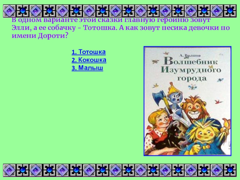 собачку - Тотошка. А как зовут песика девочки по имени Дороти? 1. Тотошка 2. Кокошка 3. Малыш