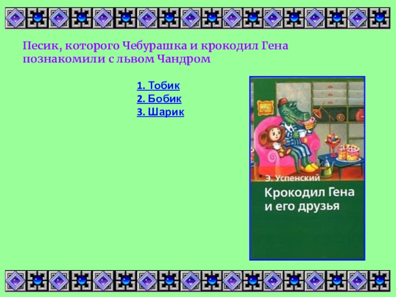 Слайд 29Песик, которого Чебурашка и крокодил Гена познакомили с львом Чандром
