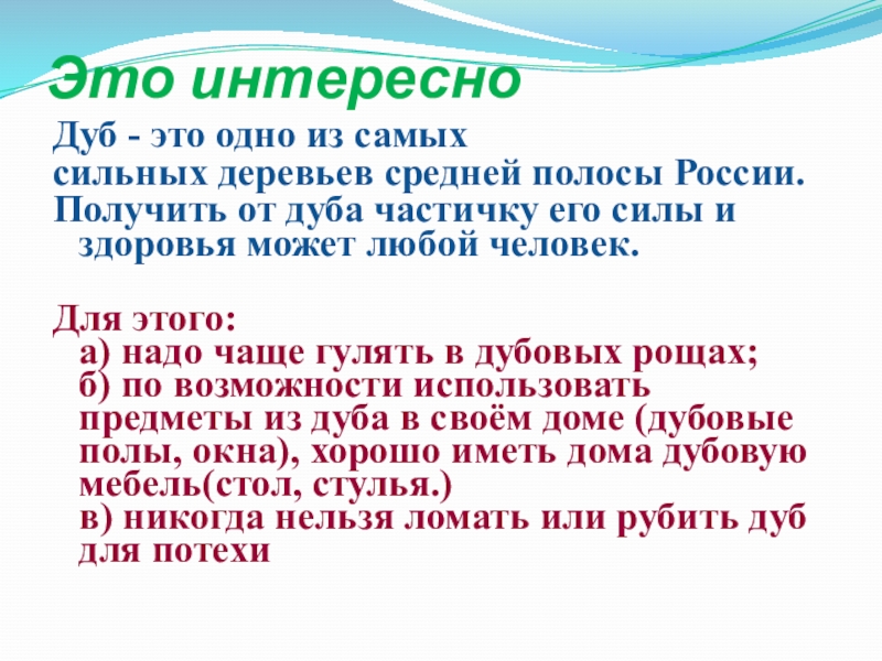 б) по возможности использовать предметы из дуба в своём доме (дубовые полы, окна), хорошо иметь дома дубовую мебель(стол, стулья.)