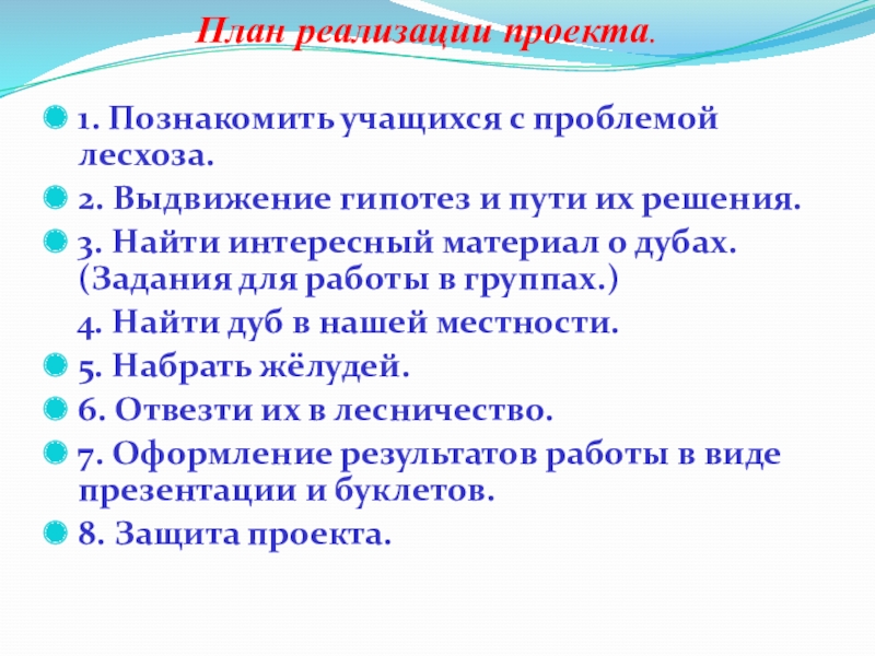 весной. Поэтому мы с ребятами решили помочь собрать жёлуди и отдать их лесничеству нашего района. Для этого мы наметили план реализации проекта.