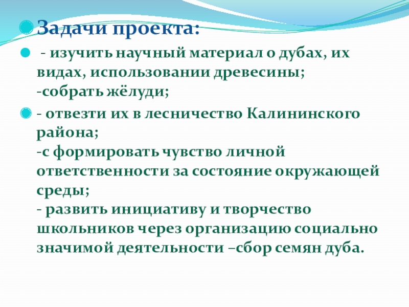 - изучить научный материал о дубах, их видах, использовании