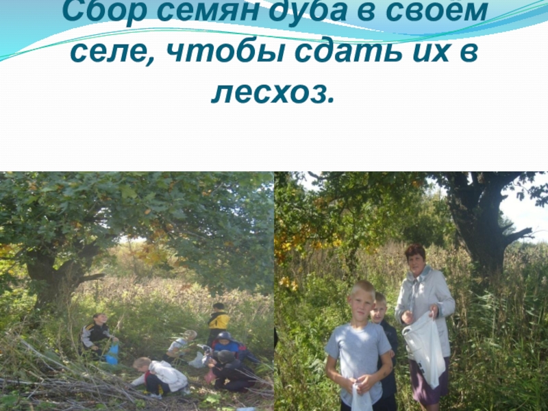 Слайд 17Сбор семян дуба в своём селе, чтобы сдать их в лесхоз.
