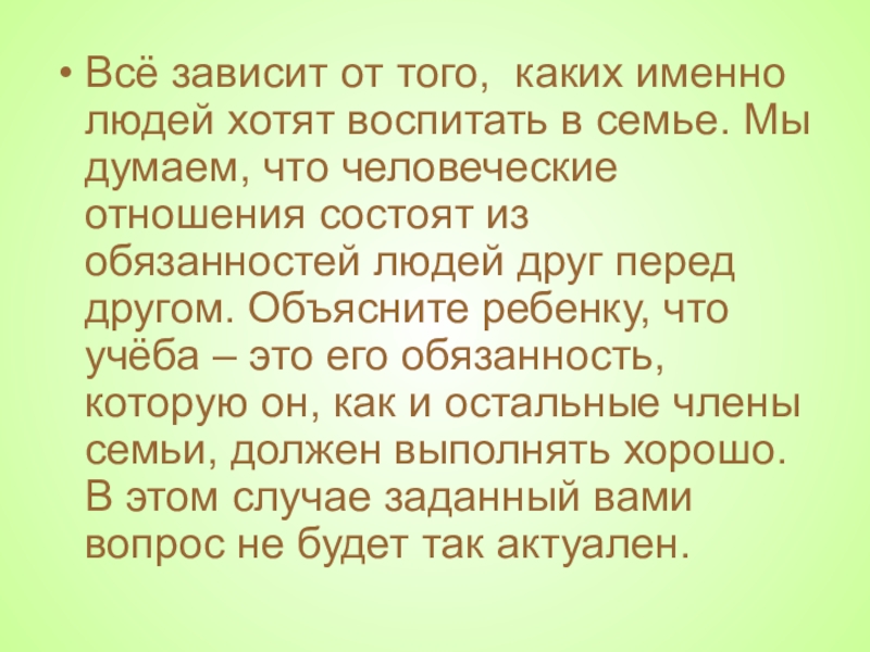 Слайд 30Всё зависит от того, каких именно людей хотят воспитать в семье.