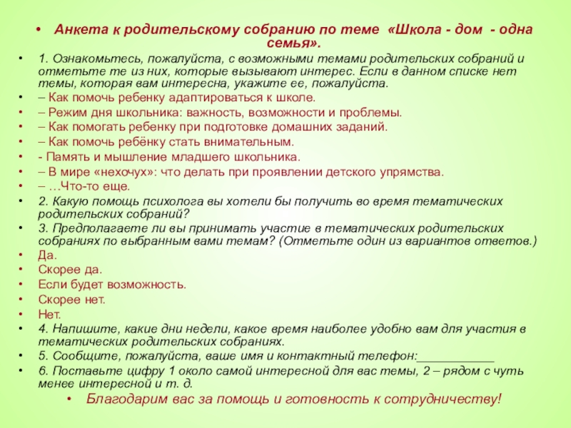 Слайд 6Анкета к родительскому собранию по теме «Школа - дом - одна
