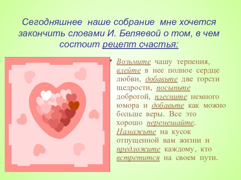 Слайд 45Сегодняшнее наше собрание мне хочется закончить словами И. Беляевой о том,