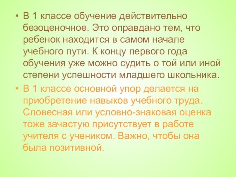 Слайд 28В 1 классе обучение действительно безоценочное. Это оправдано тем, что ребенок