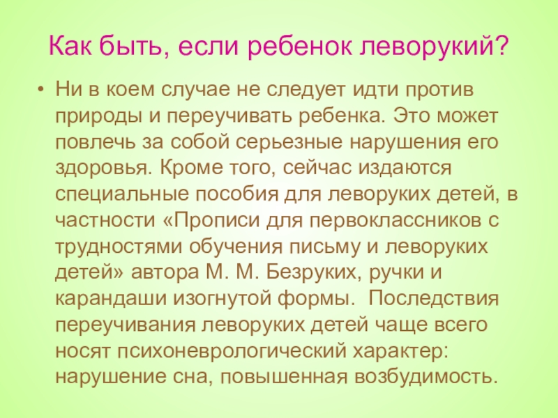 против природы и переучивать ребенка. Это может повлечь за собой серьезные нарушения его здоровья. Кроме того, сейчас издаются специальные пособия для леворуких детей, в частности «Прописи для первоклассников с трудностями обучения письму и леворуких детей» автора М. М. Безруких, ручки и карандаши изогнутой формы. Последствия переучивания леворуких детей чаще всего носят психоневрологический характер: нарушение сна, повышенная возбудимость.