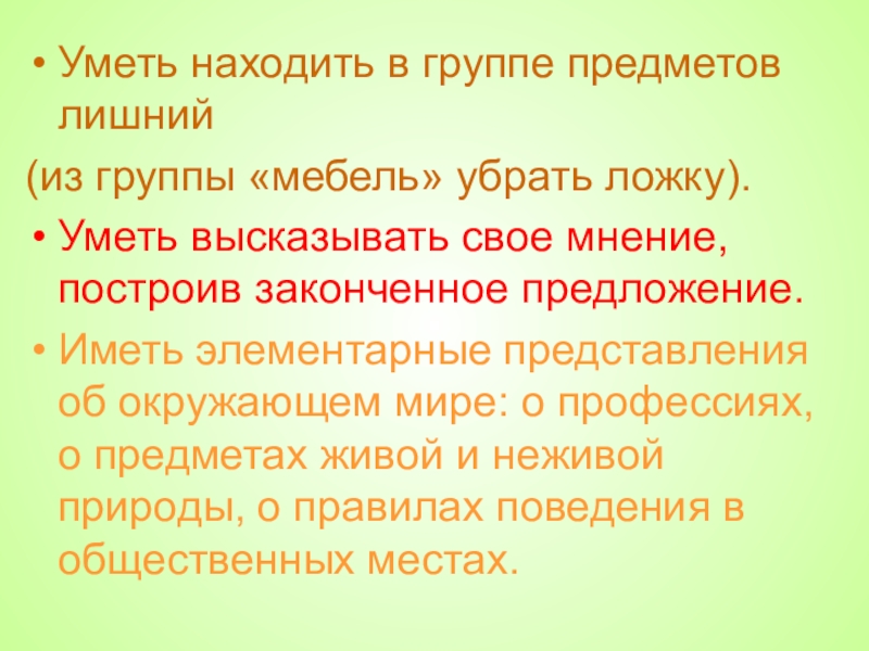 Слайд 15Уметь находить в группе предметов лишний