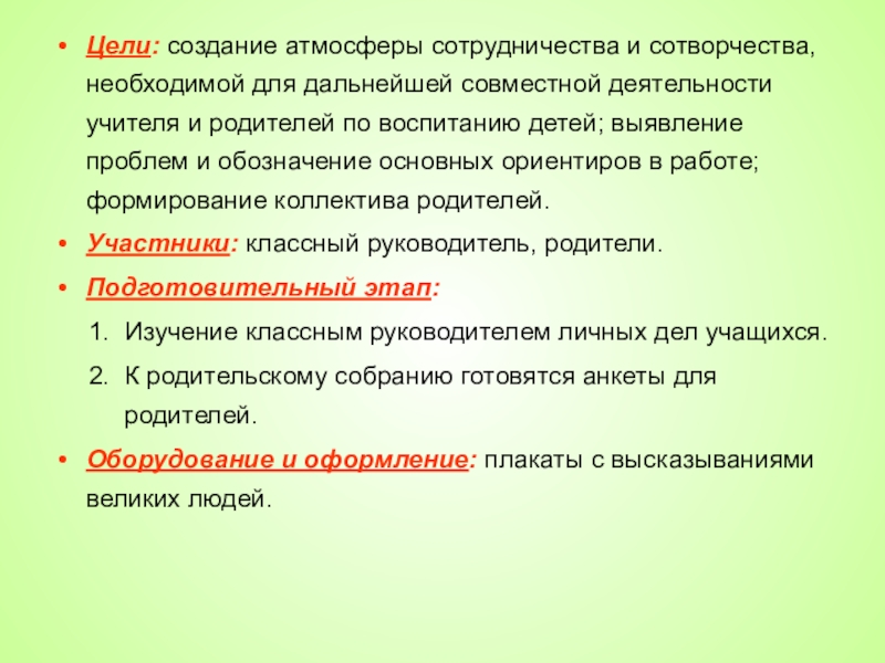 учителя и родителей по воспитанию детей; выявление проблем и обозначение основных ориентиров в работе; формирование коллектива родителей.