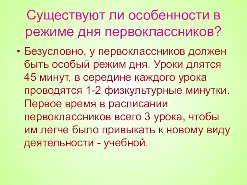 особый режим дня. Уроки длятся 45 минут, в середине каждого урока проводятся 1-2 физкультурные минутки. Первое время в расписании первоклассников всего 3 урока, чтобы им легче было привыкать к новому виду деятельности - учебной.