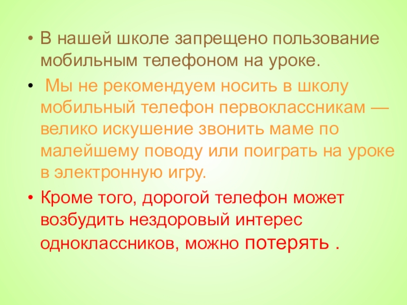 рекомендуем носить в школу мобильный телефон первоклассникам — велико искушение звонить маме по малейшему поводу или поиграть на уроке в электронную игру.