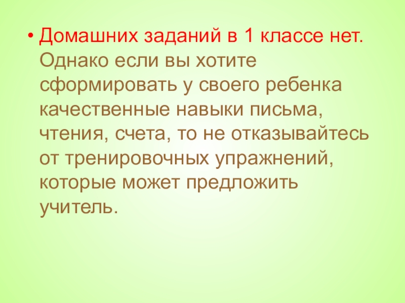 Слайд 26Домашних заданий в 1 классе нет. Однако если вы хотите сформировать