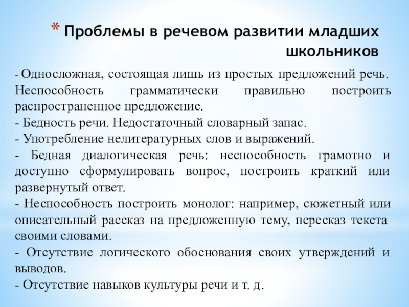 - Бедная диалогическая речь: неспособность грамотно и доступно сформулировать вопрос, построить краткий или развернутый ответ.