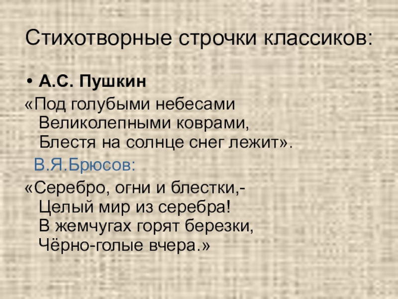 Стихотворные строчки классиков:А.С. Пушкин«Под голубыми небесами  Великолепными коврами,  Блестя на солнце снег лежит». В.Я.Брюсов:«Серебро, огни
