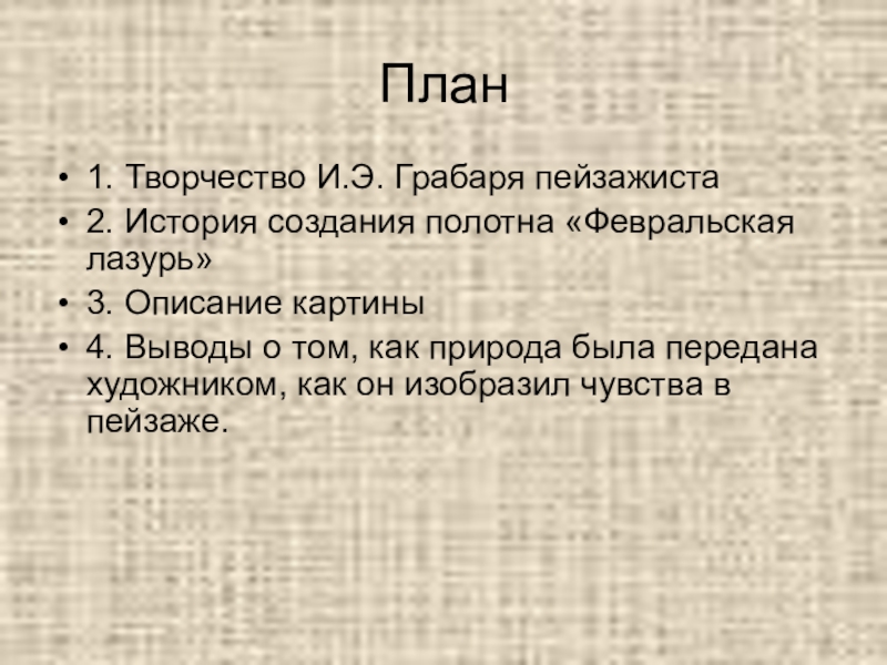 План1. Творчество И.Э. Грабаря пейзажиста2. История создания полотна «Февральская лазурь»3. Описание картины4. Выводы о том, как природа